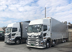 | トレーラーウィング 1台 (26t) 大型ウィング 14台 内訳 低床ウィング 13台 内 総輪エアサス 4台 低床ウィングゲート 1台 (総輪エアサス) 低床ウィングイベント車 1台 (跳ね上げゲート総輪エアサス) 高床ウィングゲート 1台 4tウィングゲート後輪エアサス 1台 ハイエース1台 フォークリフト 2台 |